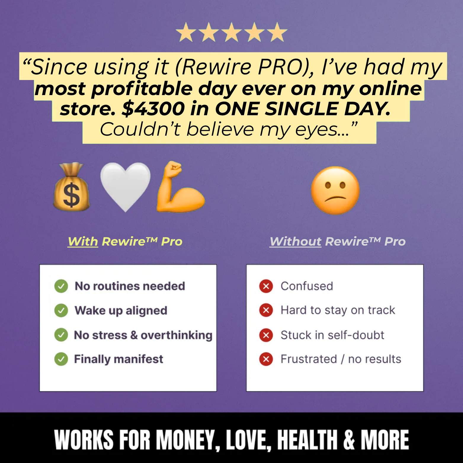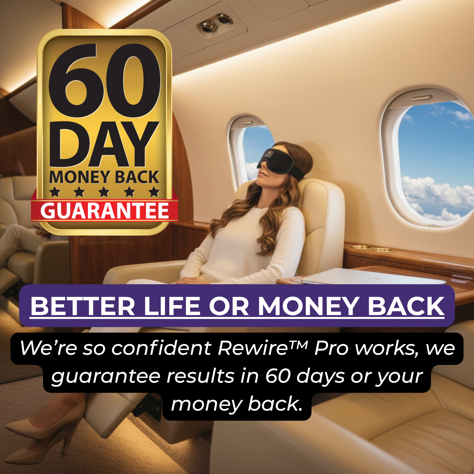 We offer a 100% risk-free experience. If you don't see any progress in your manifestation journey, or feel that Rewire PRO is not benefiting you, simply reach out to us during the 60-day period, and we'll issue you a full refund - no questions asked. (Yes, even on day 59!)